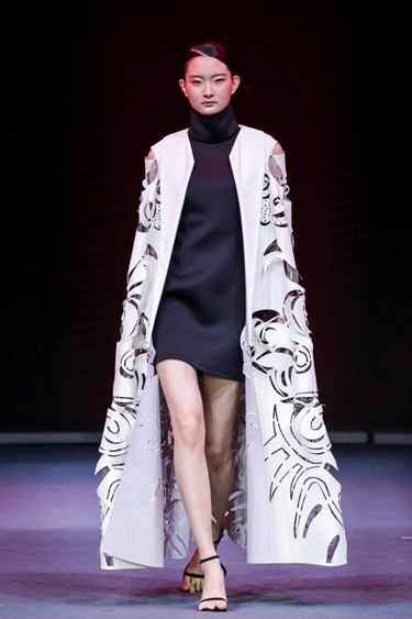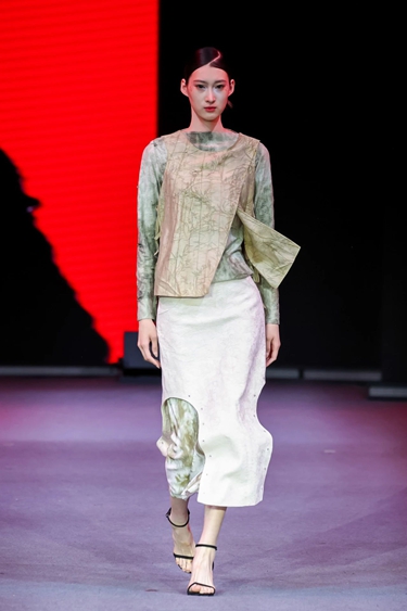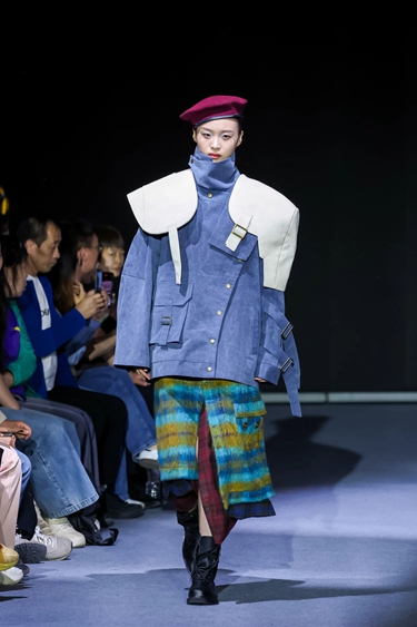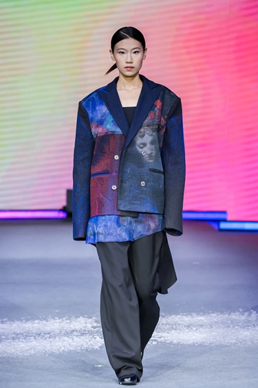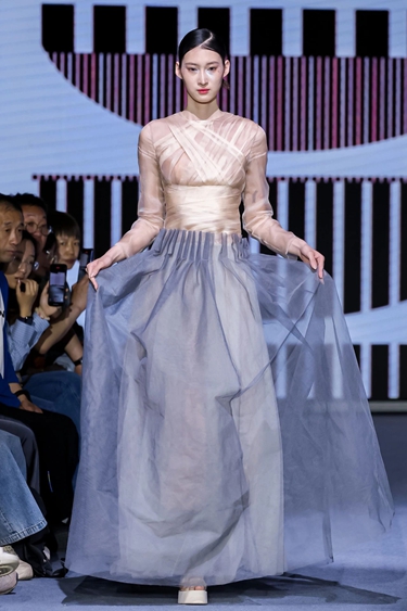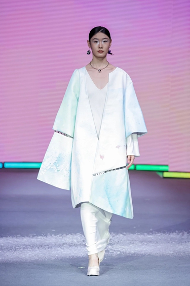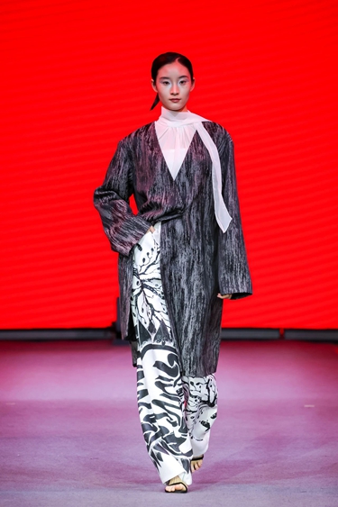 展演以“时境交响”为主题,聚焦“为人民而设计”育人理念,紧扣“美丽中国”时代主题,强调设计服务于现实生活、回应时代关切。“时境交响”寓意在时间与情境的交错中展开一场穿越的视觉叙事:“时”是文化的纵深,“境”是人文与自然的并置。青年设计师以成衣为载体,将“蓝天白云”“清水绿岸”等意象转译为具象设计语言,赋予服装以文化温度与时代质感,诠释可持续与情感关怀交织的中国时尚新主张。