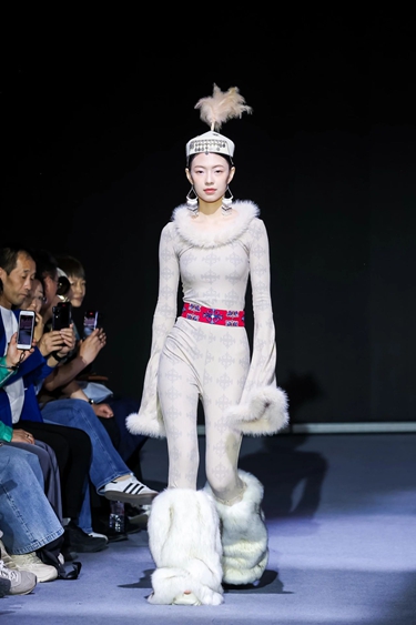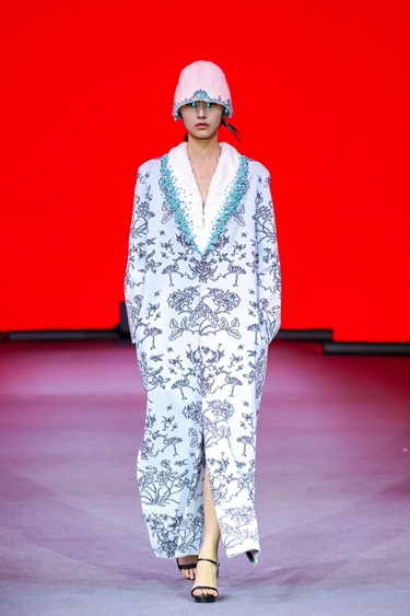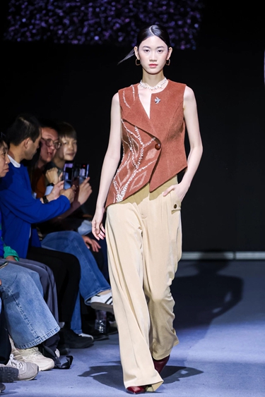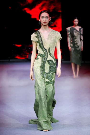 “古韵今风”单元强调东方审美在当代语境中的转译。设计师深入挖掘中国传统纹样与结构美学,将飞檐斗拱、苗绣盘扣等文化基因融入面料创新与剪裁重构,使传统符号在成衣系统中获得时代活力。