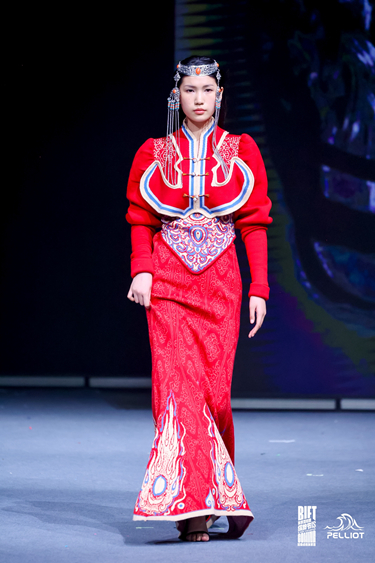 以苗银图腾的金属质感和鄂尔多斯嫁衣的浓郁色调为灵感,设计师运用提花针织模拟刺绣纹理,并结合多种针织工艺再现螺钿的层次色彩,为民族服饰与工艺品赋予现代语言,彰显东方美学的独特魅力。