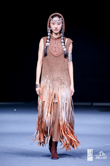 敦煌壁画的绚丽色彩、新疆民族纹样与都市生活图景在设计师的几何廓形重构、功能性纱线创新与运动风格在转化中碰撞融合。作品巧妙地将传统符号植入现代成衣,实现了审美与实用主义的平衡。