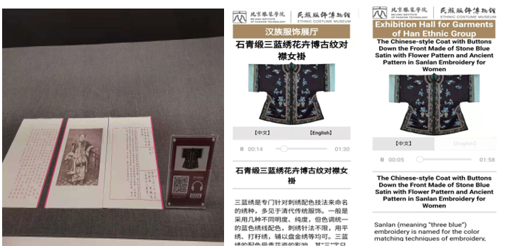 通过扫描藏品二维码,可以获得中文、英文语音及文字的藏品介绍,使馆区陈列得到更生动的体现。让广大观众在边看边听中,汲取知识,了解内涵,更好地享受历史悠久的民族服饰文化。