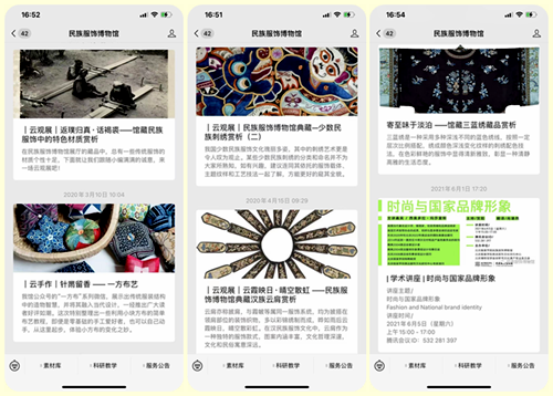 民族优秀传统服饰文化是中华民族的基因,是中华民族共有的精神家园。习近平总书记提出“要加强对中华优秀传统文化的挖掘和阐发,努力实现中华传统美德的创造性转化、创新性发展,把跨越时空、超越国度、富有永恒魅力、具有当代价值的文化精神弘扬起来。”为拓展博物馆服务社会渠道,丰富人民群众精神文化生活,推进优秀传统文化传播,博物馆发挥馆内资源优势,充分利用微信公众号平台,面向社会公众,开启工作日每周微信公众号推送服务。通过精美图片展示、专业文字介绍、生动影像记录等方式多角度介绍博物馆日常活动、丰富多彩的馆藏民族服饰、专题性展览等,全方位展现传统服饰的文化魅力,使大家足不出户便能畅享中国传统服饰之美,使博物馆进一步成为中国服饰文化交流、研究的良好平台。