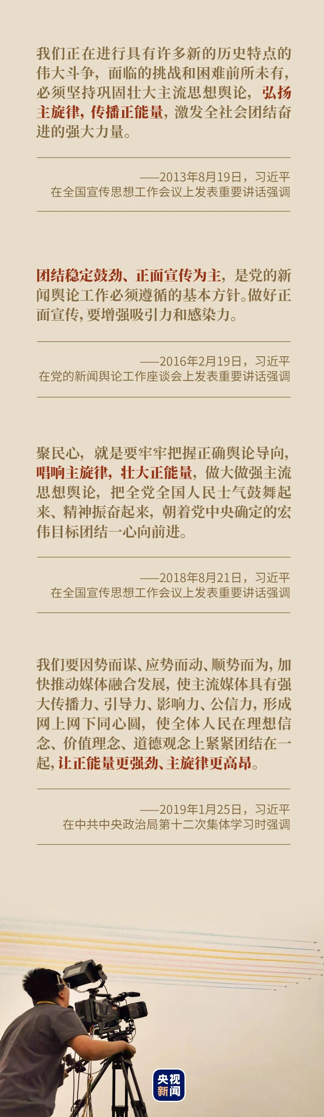 “弘扬主旋律,传播正能量,激发全社会团结奋进的强大力量”“做好正面宣传,要增强吸引力和感染力”“唱响主旋律,壮大正能量,做大做强主流思想舆论”……总书记多次强调正能量与主旋律的重要作用。
