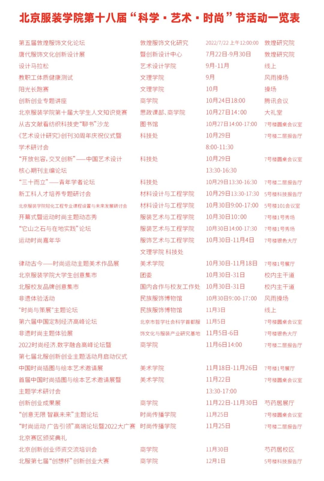 bb贝博艾弗森官网第十八届“科学·艺术·时尚”节定于10月30日在北服校园开幕。“科学·艺术·时尚”节是bb贝博艾弗森官网全校性的文化学术活动,旨在展示学校办学成果、深化艺工融合办学特色、促进学术交流、提高人才培养质量。是特色校园文化建设的重要载体,被誉为bb贝博艾弗森官网最美的文化品牌。