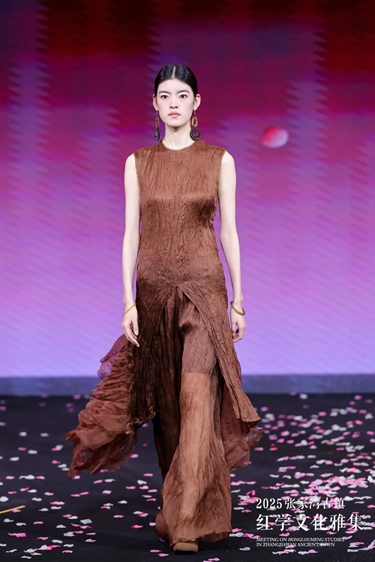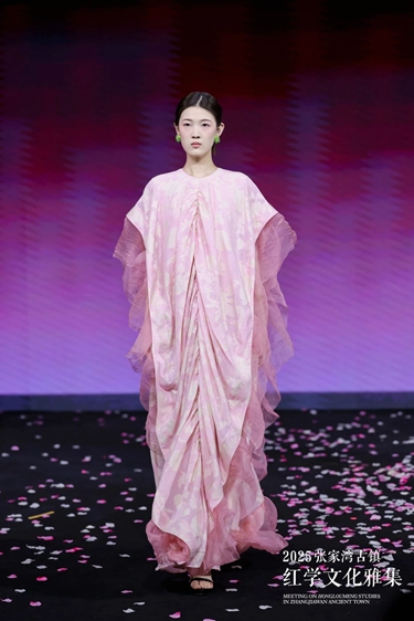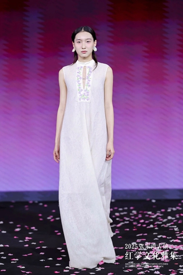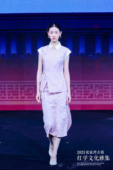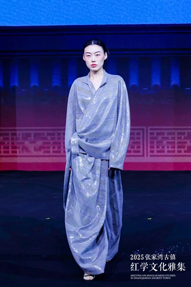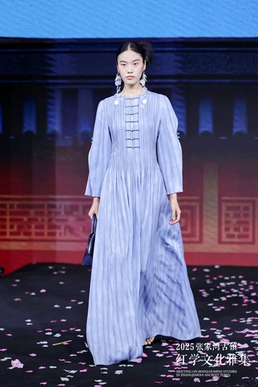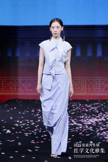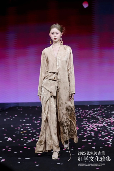 设计团队改良传统服装廓形,通过不对称剪裁隐喻大观园中的家族兴衰,增加服装故事性。在设计中,灵活融入传统立领盘扣等元素,并加入可调节的褶皱设计以丰富穿着的变化感。面料上,运用多种质感的层次叠搭,涵盖了年轻感的亮片、稳重的棉麻、素雅的提花、灵动的流苏等,旨在凸显张家湾“设计之都”的新名片。此外,纱质面料的加入带来了虚实光影的效果,将《红楼梦》的缥缈诗境凝练为可触的服装语言。整体设计保持着以现代剪裁激活传统元素,使大观园的花魂与张家湾的古韵共同生长于衣褶流转之间。
