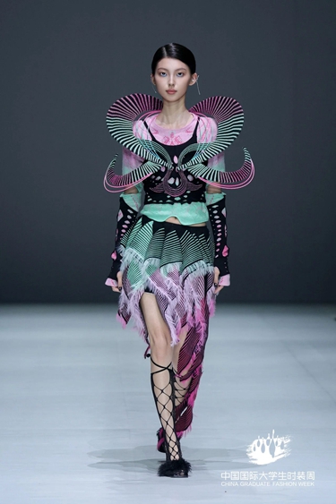 展演之后,歌力思奖学金颁奖典礼如期举行,该奖学金旨在奖励学业与创意并重的优秀毕业生,校领导、企业代表为获奖学生逐一颁发证书与奖学金。其中,歌力思•创意赛道金奖获得者为孟怡冉,作品名称《翅光织影》。银奖获得者为刘佳琪,作品名称《禁止停留》。铜奖获得者为张鉴榛,作品名称《破壳融地》。优秀奖获得者为孟冠孜,作品名称《自然疗愈师》;代巧,作品名称《宇宙独行探险服装指南》;李晨漪,作品名称《沉默的能量场/Silence,Silence》;肖业,作品名称《欧尼狗的旅途Owney The Dog》。