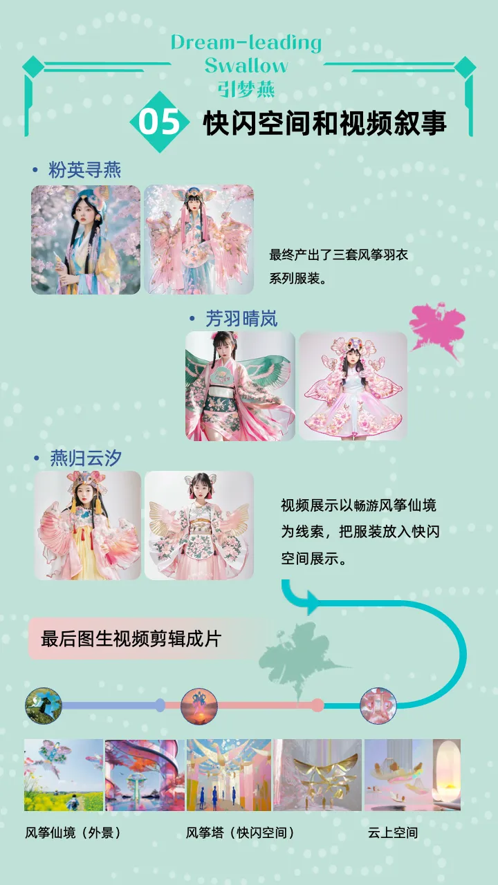 在此基础上,陈佳仪进一步搭建定制化模型,将AIGC生成的“梦核风筝”意象转译为时尚产品语言,通过结构解构与材质重构,将风筝的造型美、动态感与文化寓意延伸至虚拟服装与配饰设计中,产出多款富有东方诗性与未来感的服饰作品,拓展了非遗工艺的数字叙事路径,也为AIGC技术在文化视觉再设计中的应用提供了范式参考。