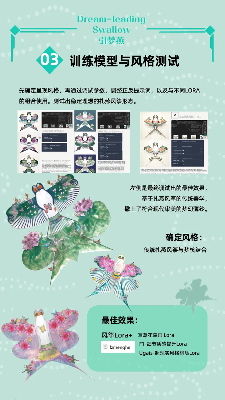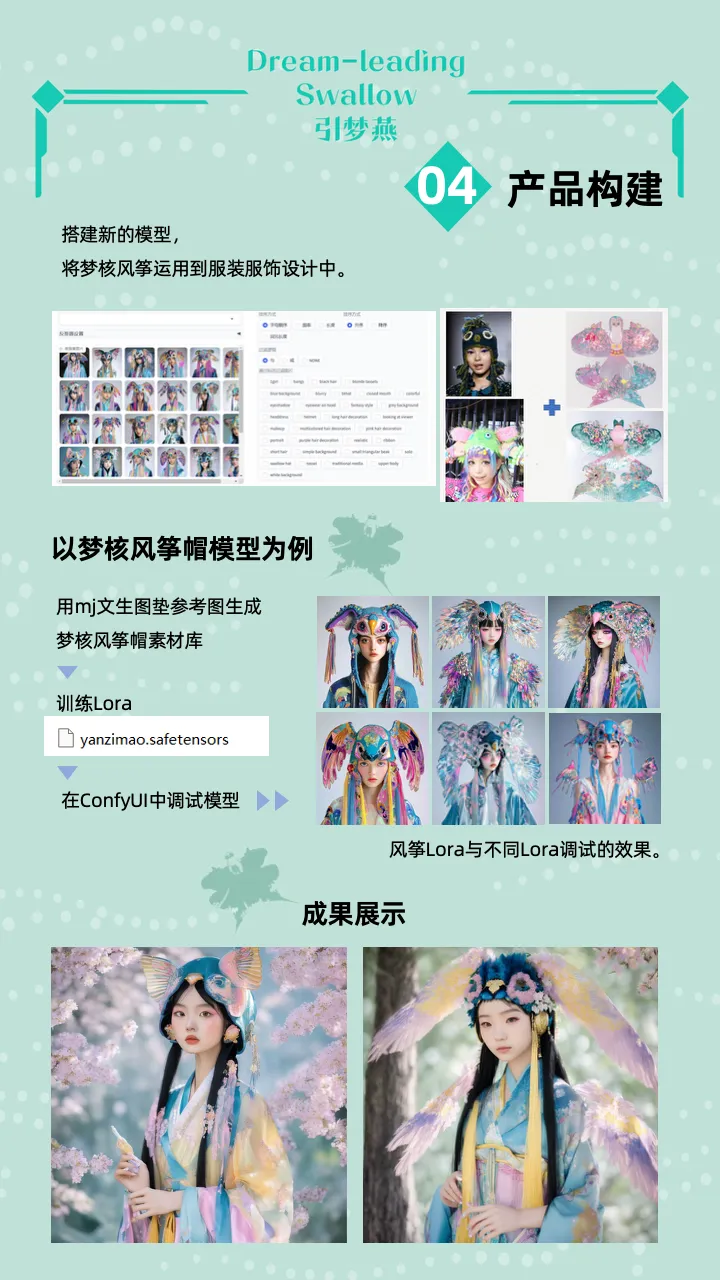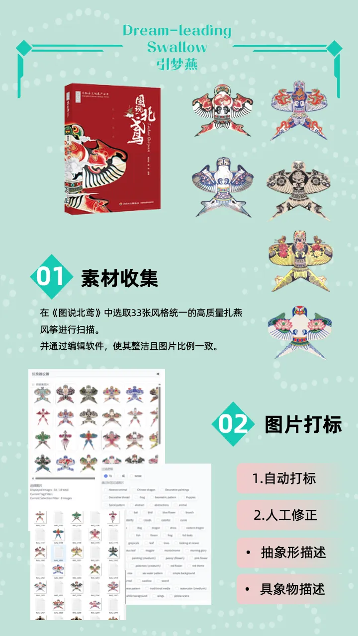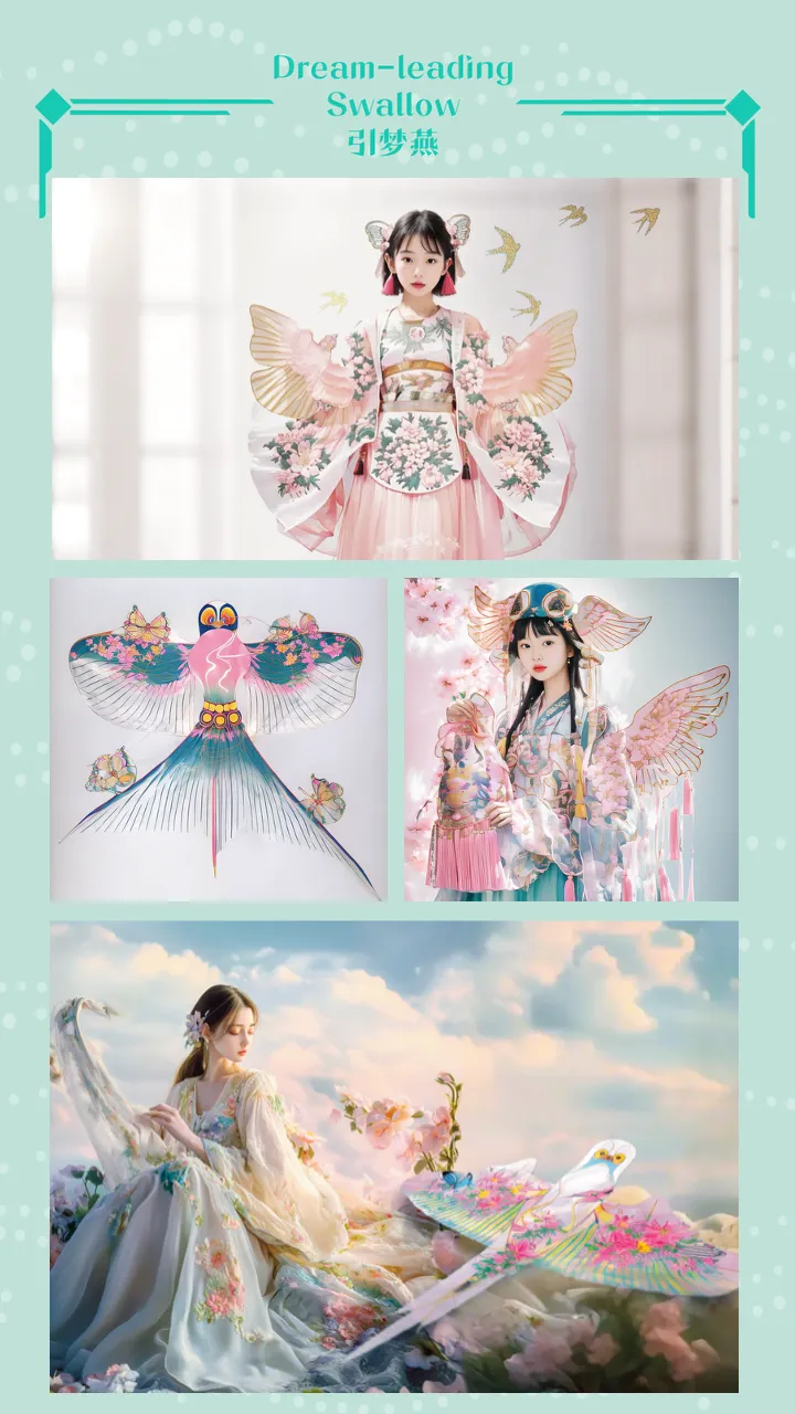 陈佳仪同学课题作品《引梦燕》聚焦于人工智能生成内容(AIGC)技术与北京非遗扎燕风筝工艺的跨界融合与时尚转译。以“梦核”美学为灵感主线,在《图说北鸢》中精心选取33张风格统一的高质量风筝图像,进行扫描与图像打标,构建训练数据集。通过反复测试提示词与LORA模型组合,在参数调试中稳定生成具有“扎燕风格”特征的图像素材,实现传统工艺意象的精准数字建模与审美风格提取。