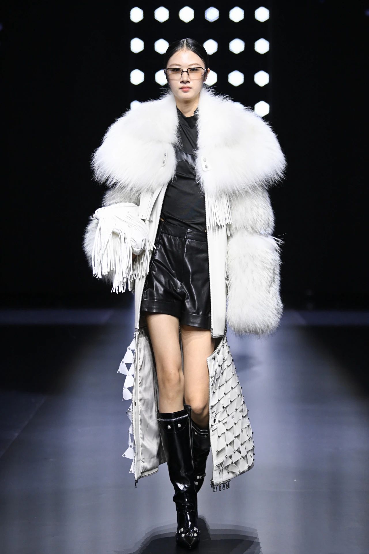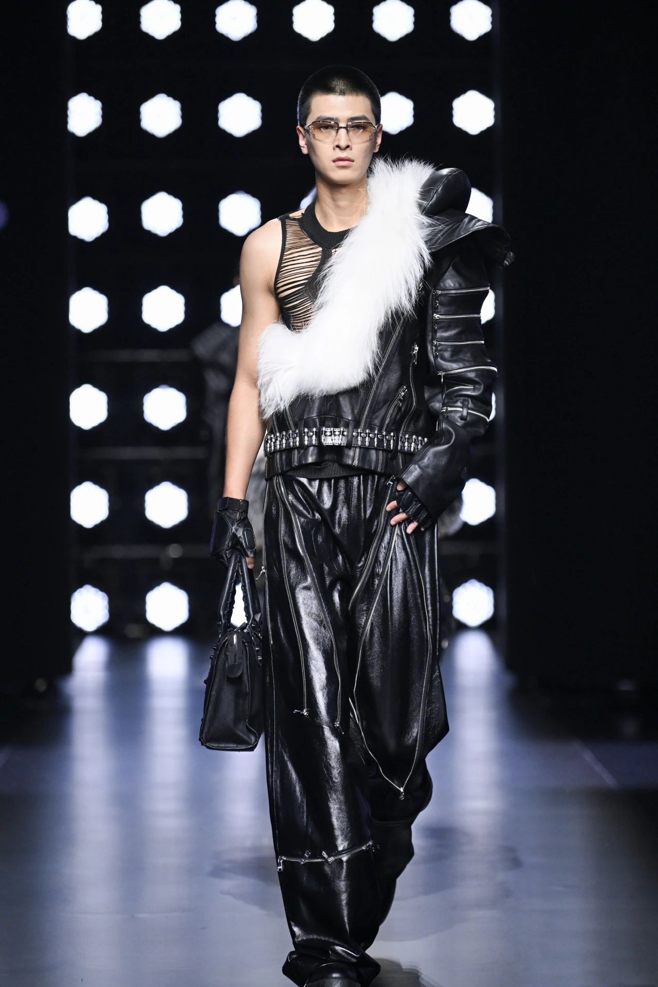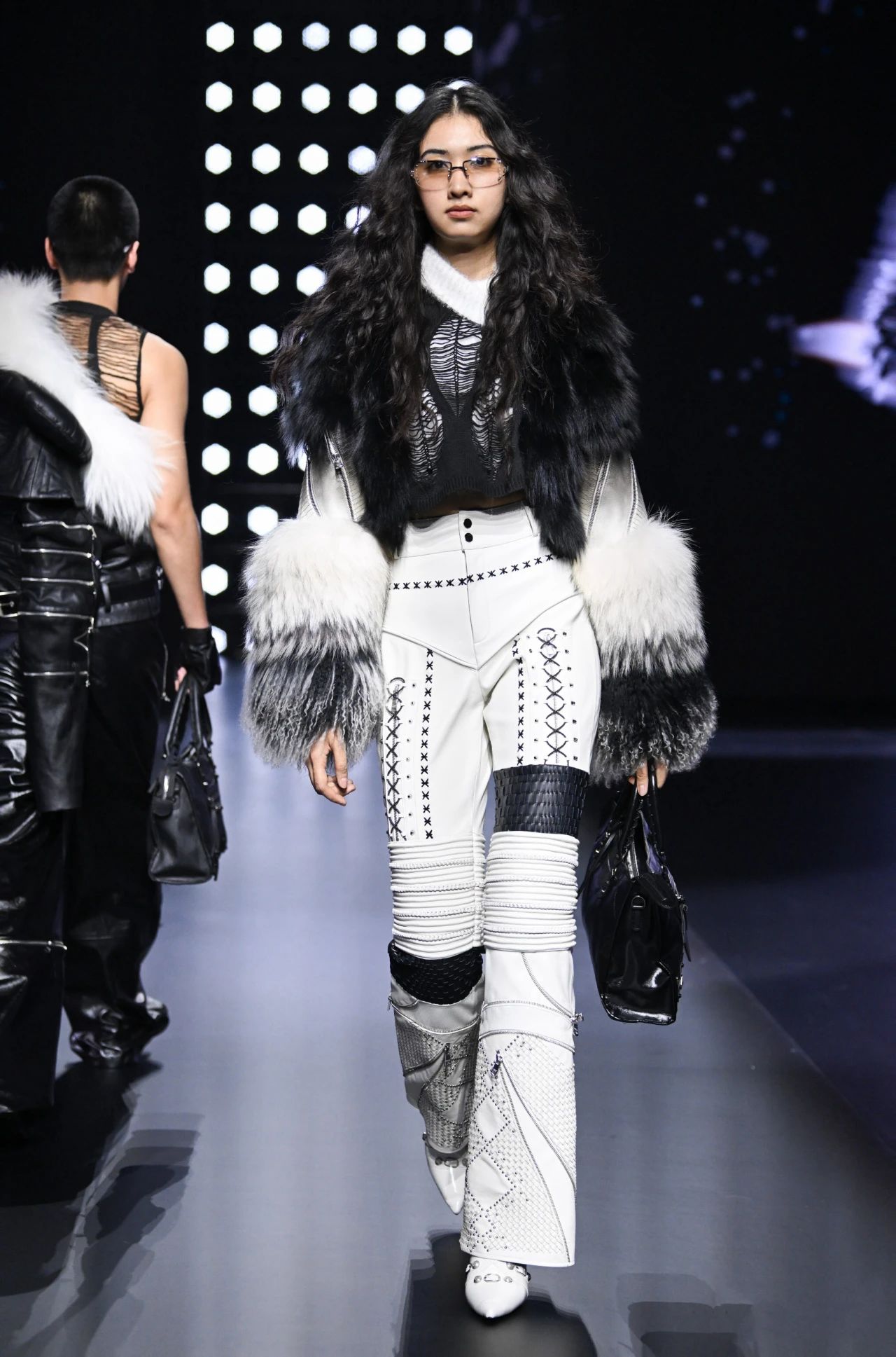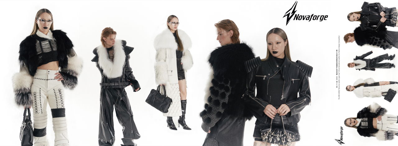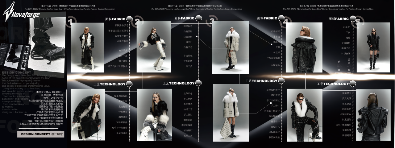 作品灵感来源于大赛主题“焕境”之星空时代,以经久耐用的高品质真皮为基底,深度挖掘其工艺价值。运用激光切割勾勒线条,通过皮革不规则编织,打破传统皮革面料的单调,突破性尝试真皮与针织的复合工艺,创造出刚柔并济的独特质感,打破“快时尚=短暂流行”的怪圈,实现从创意设计到市场转化的更多可能性。