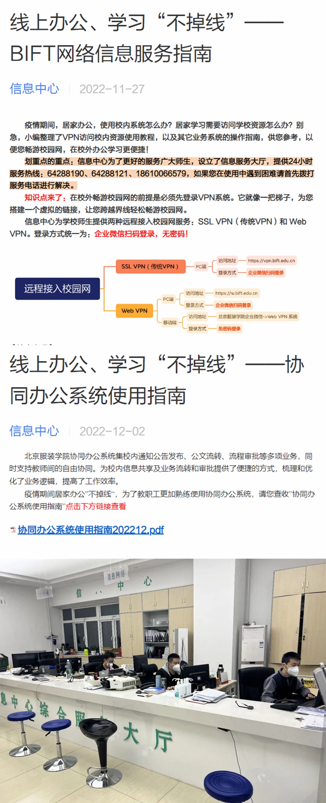 信息中心充分运用信息化手段,助力学校常态化疫情防控管理。实现了北京健康宝与校内疫情防控系统对接,构建了精准的师生基础数据台账,在各楼宇等重点部位安装刷脸设备,为疫情流调提供数据支撑。信息服务大厅为师生访问学校资源提供24小时服务,协同办公系统为校内信息共享及业务流转提供了便捷。