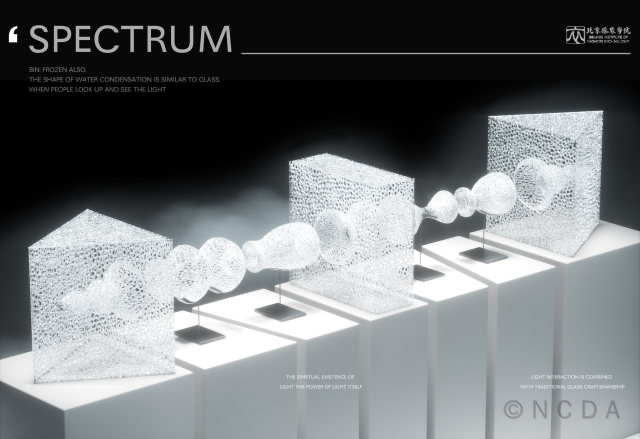 仌:冻也。像水凝之形,与琉璃异曲同工。通过技术与艺术结合、灯光交互与琉璃工艺碰撞,在实践中探索物理现象的艺术化表达,将理性的技术、感性的知觉与精致的视觉结合,意在创造出一种纯粹的、超然的光艺术形态。向人们揭示了光的精神性存在,证明光自身之力量。作品将交互技术中的灯光交互与传统琉璃工艺结合,以光学频谱的图像进行提取整合运用于琉璃的实体创作中,并利用编程技术控制灯光,通过线光的灯光照射形式将原本整体的空间重新划分割裂,最终联结,打破作品与空间的边界,从而进一步探究光与作品、观众以及空间的联系。