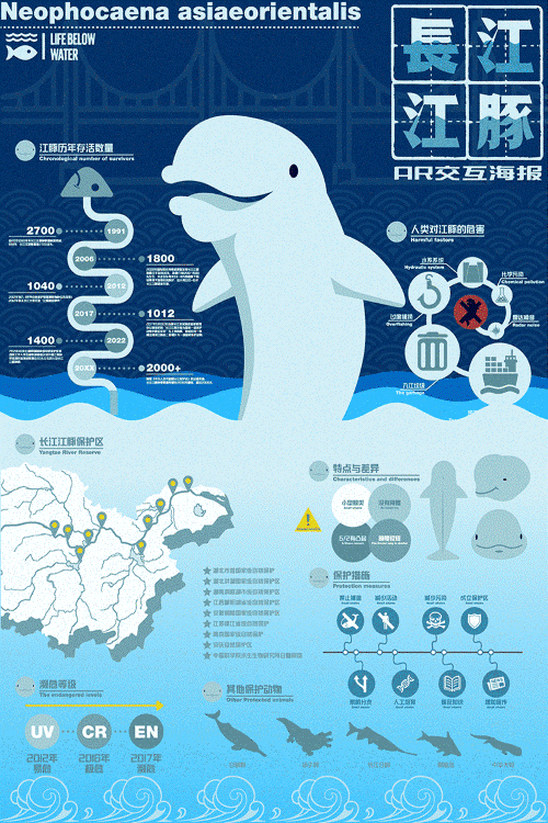 海报以江豚跃出水面的动作为主题,背景采用了水波纹与长江大桥的简化剪影,将长江江豚的特点、历年存活数量、保护区地理位置、濒危程度以及保护措施等信息,以可视化的形式呈现在江豚周围。利用手机扫描即可观看AR动态海报,使人们充分了解长江江豚的信息与保护手段,达到呼吁保护江豚的目的。