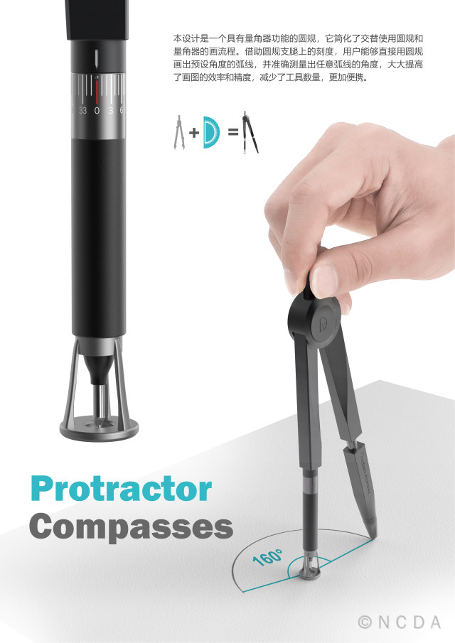 设计作品是一个具有量角器功能的圆规。简化了交替使用圆规和量角器的绘画流程,借助圆规支腿上的刻度,用户能够直接用圆规画出预设角度的弧线,并准确测量出任意弧线的角度,大大提高了画图的效率和精度,减少了工具数量,更加便携。使用传统工具绘制弧线时存在以下问题:需要用量角器辅助设定弧线角度;圆规与其他工具交替配合,操作复杂;画图时需要多种工具,不方便携带。本产品将量角器的刻度盘与圆规支腿相结合,替代量角器,可单独使用。在圆规的转轴处加上刻度盘,可以看出圆规两脚的夹角大小。