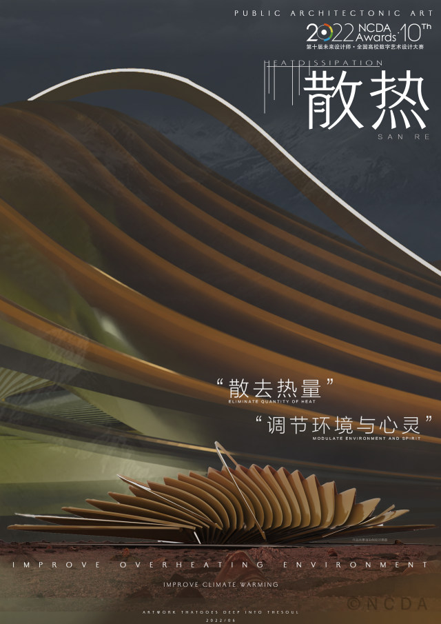 作品以全球气候变暖为创作灵感。由于温室效应不断积累,导致地气系统吸收与发射的能量不平衡。能量不断在地气系统累积,从而导致温度上升。为呼吁民众减少热量排放,试图诠释“散热”一词,运用“散热片”元素为创作基础,结合风、光、土地等自然元素将大自然的随机性融入作品当中。作品设计巨大的散热装置,色彩暖而不热,使观者融入其中。通过流动的风、散热片的间隙,感受炽热环境下的丝丝凉意。逐步嵌入地下的设计更加贴近自然,使观者舒缓压力,平复情绪。