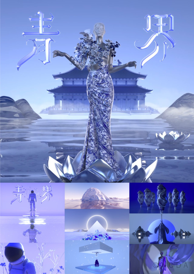 设计师曾以《青花》为帆开启服装设计的梦想远航。时隔十七载,以动态影像为主要创作媒介,营造具有中式美学叙事性的概念空间氛围,打破传统的时尚展示方式,从物理世界迭代升级到数字时代呈现《青界》,希望归来仍是少年。我们始终不断地在思考服装的价值和使命究竟是什么?这个问题无论是在物理世界还是在数字世界都值得思考,因为太多的商业价值掩盖了服装本身的使命,千百年以来服装一直作为文化的载体或“文明的布道者”在默默记录着时代变迁。青花做为世界公认的中国风格关键词,设计师该如何将它融合转化为艺术是本次设计的底层逻辑。从中国航天科技到古老的四大文明,从时装发源地欧洲到自我创作,这不仅是一场时装秀,更是对文明共荣的可能性探索。中华文化可以穿越历史和空间,穿梭现实与虚拟世界。