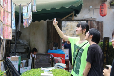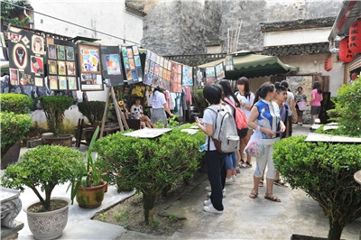最后,北校区暑期社会实践团还举办了“堪画西递 印象北服”同名书画展。通过前期在线上、线下的宣传,很多游客以及当地居民在活动当天都慕名前来。上午10点展览开始,前来参观的人络绎不绝。游客们对展出的作品给予高度评价,为作品中所展现的巧思赞叹不已。本次展览也展出了实践团成员——造型艺术系国画班同学们的优秀书法作品,内容以徽州当地优秀的楹联为主。这些书法作品意在让观众们欣赏优美书法的同时,也传播悠久的徽州文化。书画展体现了北服学生的创作才华、技艺和思想之美,展现了同学们良好的精神风貌,也向来自全国各地的游客展现了西递优美的自然风光和浓厚的传统文化。