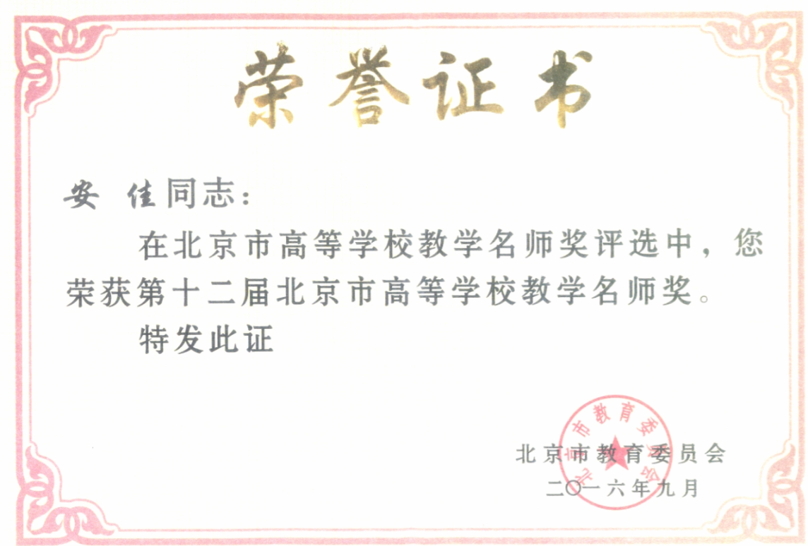 - 安佳教授荣获第十二届北京市高等学校教学名师奖