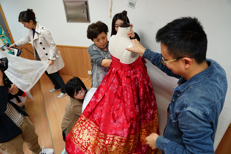 民族服饰博物馆高度重视此次展览,成立专门工作组,展前多次与韩方代表联系,沟通展览事宜。韩方派出了以朴圣实教授为团长的强大阵容,参加布展和讲演。展品抵达后,顺利交接,韩方专家不顾舟车劳顿,亲自上阵,和民族服饰博物馆师生昼夜奋战,对每件展品进行了细致的整理,以严谨精致的风貌,完美地呈现在观众面前。