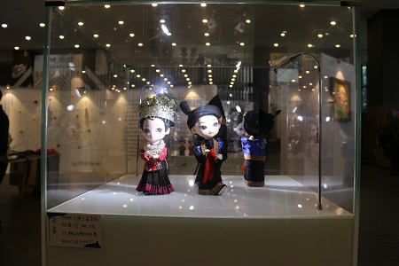 北京绢人是北京特有的一种传统民间艺术品,是以丝绢为主制成人形的民族手工艺品,有一千多年的历史。绢人,是美术人形的一种,民间布制玩具“针扎”、“彩扎”等手工艺品,都和它有着密切关系。它取材于中国民间故事中的历代仕女、戏剧人物和民族舞蹈造型等题材。艺人们经过雕塑、彩绘、服装、道具和头饰等十几道工序的精细手工制作,做成栩栩如生的立体人型。它的头脸和双手都是用蚕丝制作的,从头到脚、从里到外都选用上等丝绸、纱绢,“绢人”由此而得名。此次展出作品分为“传统绢人”和“唐娃娃”(包括精品机绣、大眼萌娃和Q版系列绢人3种类型,为改良版绢人)两类。其中,《待嫁》和《杨贵妃》为传统绢人工艺,纯绢丝制作、惟妙惟肖。