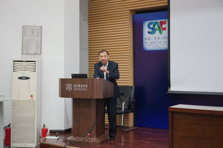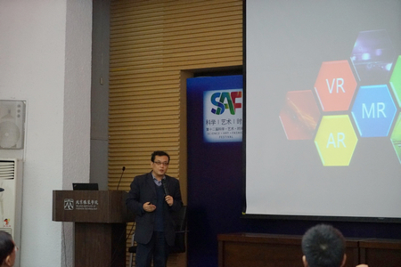中国传媒大学新媒体研究院副院长曹三省教授的演讲《虚拟现实新媒体进展与应用》介绍了虚拟现实(Virtual Reality,简称VR,又译作灵境、幻真)、增强现实技术(Augmented Reality,简称 AR)、混合现实技术(Mix reality,简称MR)和扩展现实技术(ER)等新媒体技术的最新进展。指出无论寄身于何样的技术躯壳,新媒体技术始终承载着联结现实与想象、对冲物质与精神、贯通眼耳鼻舌手身与心灵意识思维的无止境的梦想与希冀。今天,数字技术驱动下的媒体形态,仍然是远非完善的;未来的媒体创新,仍将具有不断发展不断更新的内涵和范畴。现场的师生饶有兴致地体验了曹三省教授带来的轻VR眼镜,感受有如身临其境、可以360度观看的立体照片。