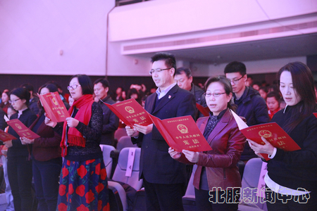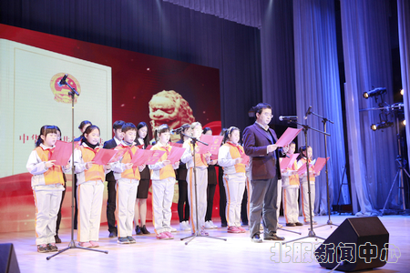 北京市教委教工委委员、市教委副主任李奕带领与会人员诵读宪法
