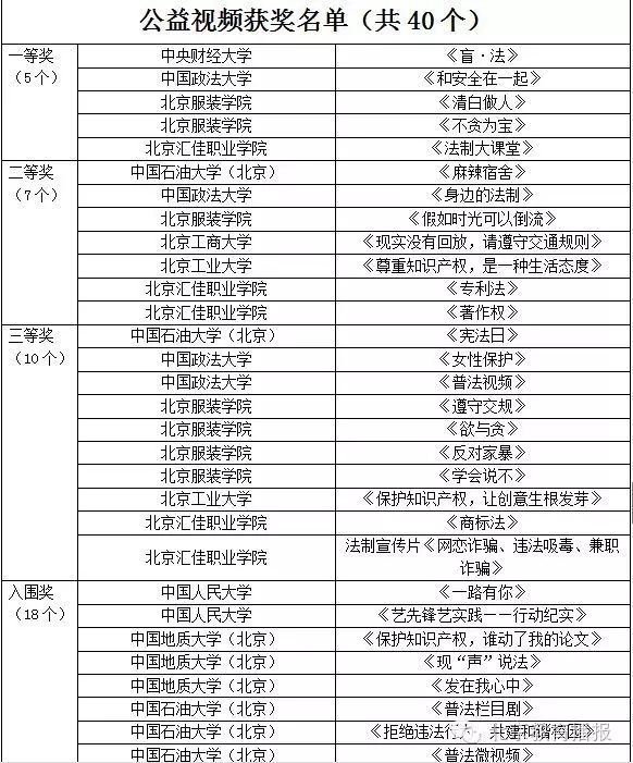 活动在全场诵读《宪法》声中拉开序幕。来自中央财经大学的周远洋同学和东城区东城区和平里九小蔡闰羽同学进行了宪法主题演讲。活动现场对第四届北京高校普法微视频作品征集展映活动中的的优秀作品及单位进行表彰。此次活动共收到28所学校提交的130部作品,其中微电影作品90部,公益视频作品40部,作品数量与往年相比大幅增加,作品质量也有较大提升。我校积极组织学生参与,作品融合专业性和思想性,体现了北服学子对社会问题的关注与思考。我校共申报普法类微视频16部,动画14部。在微电影类评比中,《一支钢笔》获得一等奖,《杀人回忆》、《不忘初心》获二等奖,《枪手记》、《母亲》获三等奖;在公益视频类评比中,《清白做人》、《不贪为宝》获得一等奖,《假如时光可以倒流》获二等奖,《遵守交规》、《欲与贪》、《反对家暴》、《学会说不》获三等奖。另有多部作品获得入围奖。bb贝博艾弗森官网获得了优秀组织奖。