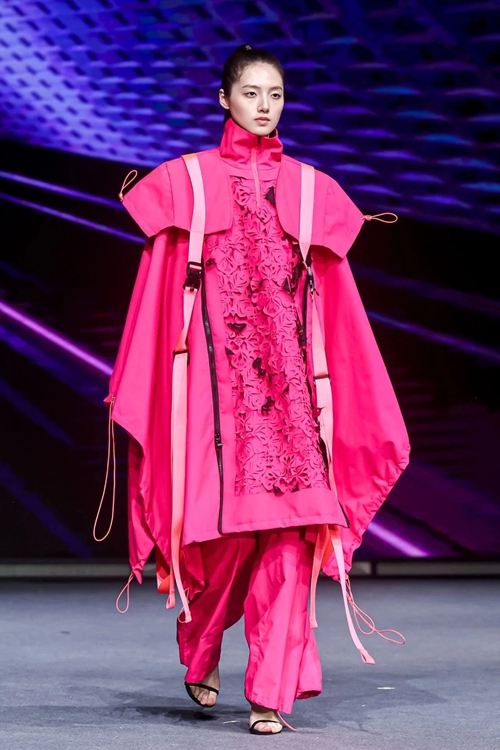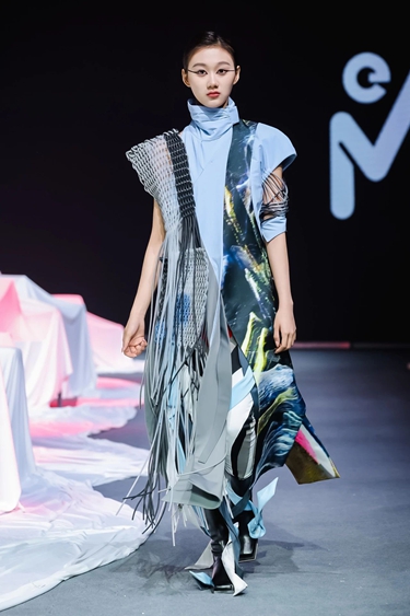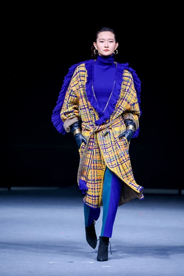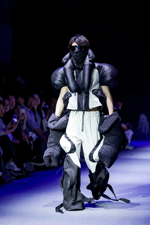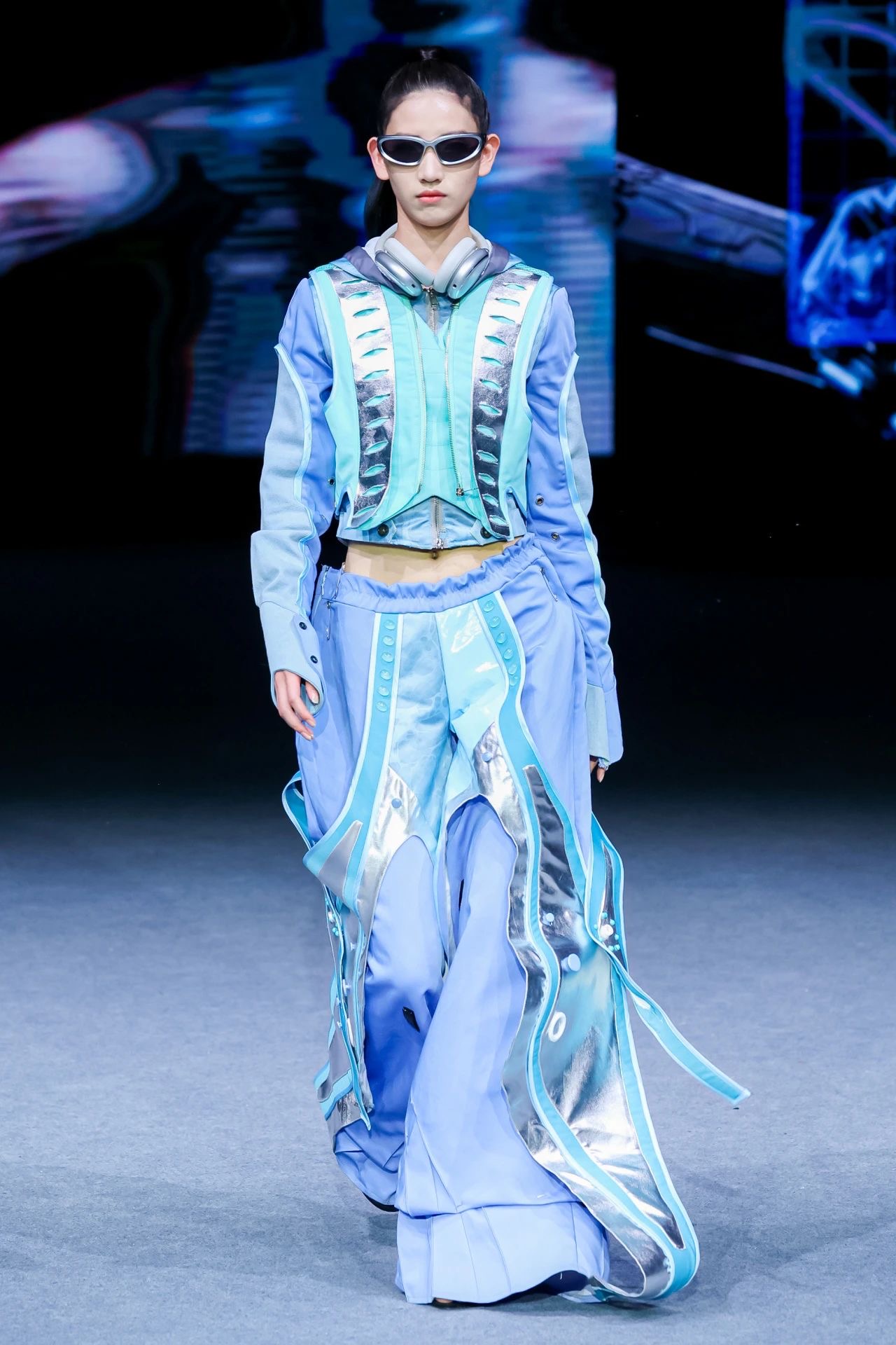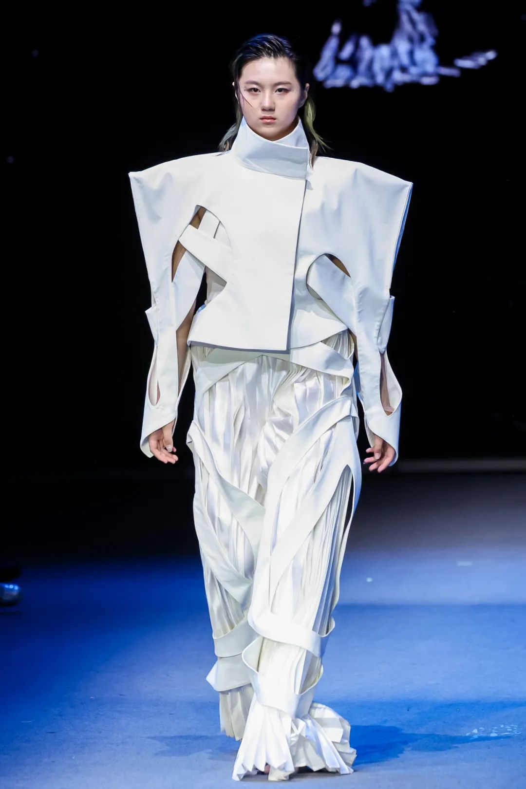步入秀场,层叠轻纱装置随光线流转,冷白、深黑到暖黄的渐变,隐喻着从文化觉醒到未来探索的奇妙叙事。四大篇章各具魅力:“觉醒时刻”以极简主义解构传统汉服,展现审美觉醒;“重构实验”用硬朗剪裁碰撞柔性面料,暗藏市场转化巧思;“在地新生”融合非遗工艺与现代技术,践行可持续理念;“未来提案”则以参数化印花与生物基材质,勾勒出未来时尚图景。