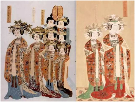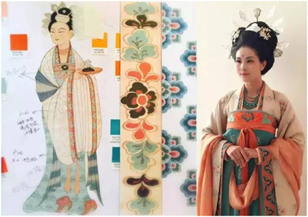 本次作品是以敦煌洞窟唐代壁画供养人为原型,仿制6套传统式样的敦煌唐代女性服饰,尽可能忠实壁画人物形象原貌,恢复使用传统染、织、绣等手工技艺 ,再现盛唐时代中国传统服饰的华丽绚烂的风貌。另外延伸设计创新作品24套,是以敦煌唐代艺术元素作为创作的主题,整体色彩借鉴楚艳近年来整理出的唐代传统红色体系,提炼唐代艺术元素,研究探索敦煌唐代元素在现代服饰的创新应用。楚艳老师表示:“研究唐代服饰,基本上一定会做敦煌这方面研究的。”