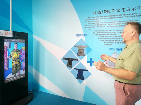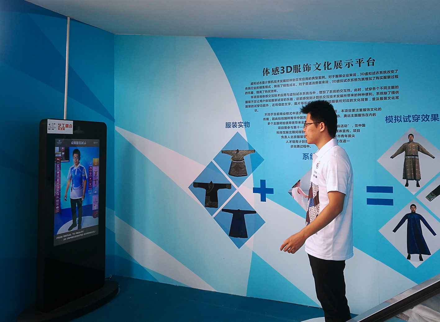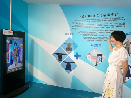 其中,在所有产品展示区中,体感3D服饰文化展示平台最受欢迎。3D虚拟试衣系统除提供服装的试穿功能外,还借助文字、图片等形式全面介绍不同服装所对应的文化背景,普及服装文化常识。不同于目前商业模式中逐步推广的3D虚拟试衣系统,本项目更注重服饰文化的传播,因此包括国粹箐华中国历代服饰、少数民族服饰、奥运主题服饰在内的多个主题将都给使用者带来全新的体验。