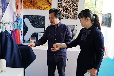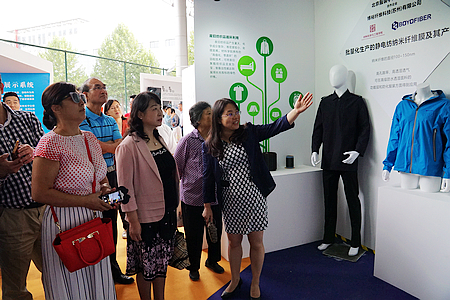 智能材料展区,展示针对空气污染防护的过滤纤维及自主研发的空气过滤装置、日常防护用口罩;新型电致变色窗以及柔性变色服装和纺织品吸引了很多观众亲身实验,其中柔性变色材料变色温度可控,赋予了服装智能和时尚美观性,满足了现代消费市场对服装个性化、智能化的需求。蛇咬模拟测试器的展示为防蛇咬纺织品的检测与评价提供依据。