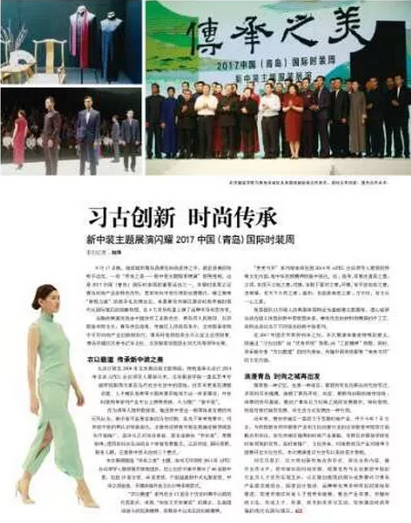 9月17日,由青岛市政府、中国纺织工业联合会、bb贝博艾弗森官网主办,bb贝博艾弗森官网中关村时尚产业创新园协办的“传承之美——2017新中装主题服装展演”亮相青岛。由党委宣传部邀请的中央电视台、北京电视台、中国新闻社、人民日报、纺织服装周刊、中国纺织杂志等多家媒体进行了现场报道。其中,中央电视台9月27日的《朝闻天下》栏目以《传承之美:“新中装”的时尚表达》为题进行了专题报道。节目中介绍,本次展演带来了66套新中装系列,包括18套女装、48套男装,作品涵盖新中式礼服套装、中华立领套装、开襟连袖外套及长衫等多种款式。构架出适应当下不同场合的新中装系列,给观众带来一场传承中华服饰之美的时尚盛宴。刘元风院长在接受采访时说,我们要立足于传统服饰文化的文化内涵,着眼于国际流行时尚,落脚于消费者的服用功能和审美需求,打造适合国人的新中装版型体系。