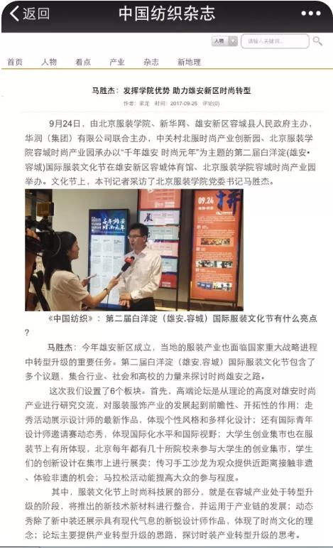 在接受北京电视台记者采访时,马书记在谈到北服与容城开展的合作时说:2015年以来,容城县人民政府与bb贝博艾弗森官网共同举办了首届服装文化节,先后成立了“bb贝博艾弗森官网白洋淀服装文化创意中心”“bb贝博艾弗森官网中小学学生装(校服)研究中心成果转化基地”“bb贝博艾弗森官网容城时尚产业园”以及“bb贝博艾弗森官网服装艺术与工程学院校外实践基地”等,这些机构和基地的成立和建设,对加快容城服装产业从服装制造到时尚产业、从定制中心到设计中心、从一般消费到现代生活方式研究的转型升级起到积极的促进作用。