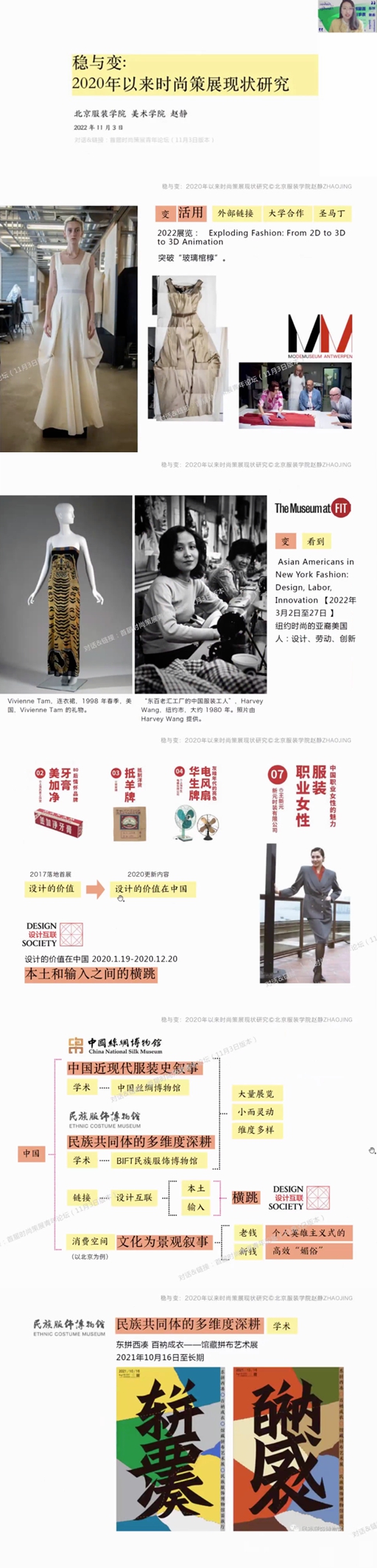最后一位演讲者是bb贝博艾弗森官网美术学院副教授赵静,发表了《稳与变:疫情以来(2020-)时尚策展现状研究》的主题演讲,她从全球博物馆的时尚策展案例的类型分析切入,表达了她对于展览案例在文化视域下的观察;分析了作为全球时尚资源的一种调度与管理方式,时尚策展如何成为文化叙事的方式之一;对比了博物馆与商场中的时尚文化表达有何不同?以及在内容的在地和资源的求变中,博物馆又可以多大程度上在“稳”与“变”中博弈。