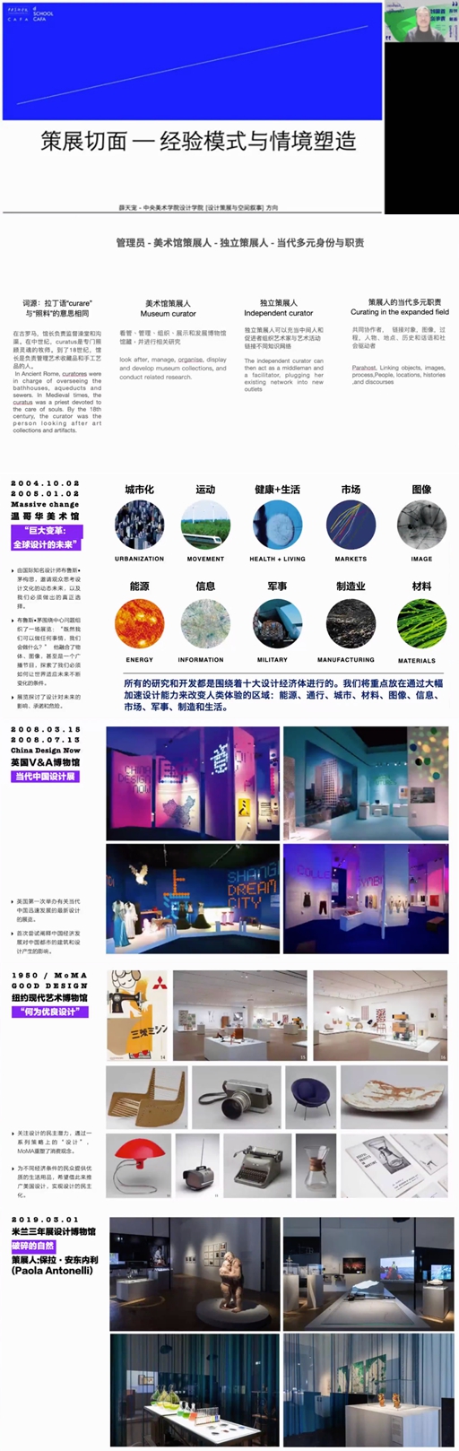 接下来的演讲者是中央美术学院设计学院的薛天宠老师,作为央美设计策展与空间叙事专业方向召集人和设计学院展览部负责人,为大家带来了《策展切面 ——经验模式与情境塑造》的主题演讲。薛老师介绍了央美设计策展的课程框架,以及策展人在当代的多元职责,提出策展人应该:“视野全球,着眼于中国文化语境,为设计策展实践提供理论模型,为设计学科中策展模式提供路径与方法。以设计策展推动、补充中国学界中设计批评、设计收藏、设计博物馆建设、设计策展教学、等内容,构建话语体系。”他还以当代艺术、设计发展流变为基础,结合展览史和研究已有展览模式,对策展实践的多种可能性进行探讨。