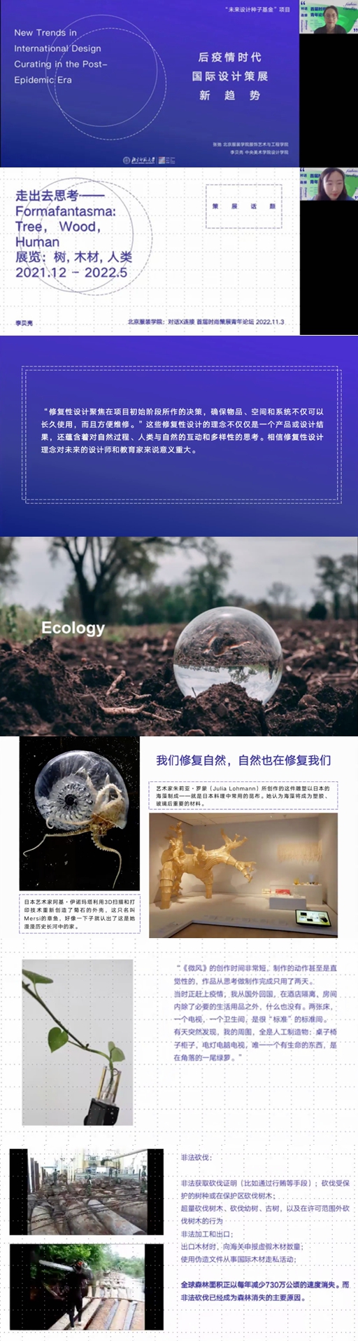 第二个演讲主题是《后疫情时代国际设计策展新趋势》,由bb贝博艾弗森官网服饰艺术与工程学院助理教授张弛和中央美术学院设计学院设计策展方向教师李贝壳共同完成。她们以共同合作的研究成果为基础展开,通过聚焦海外知名设计博物馆最近三年以来的主要展览,讨论了在博物馆的语境之下,后疫情时代的设计与设计策展所产生的新变化,并反思当代设计在后疫情时代应承担的角色及责任。
