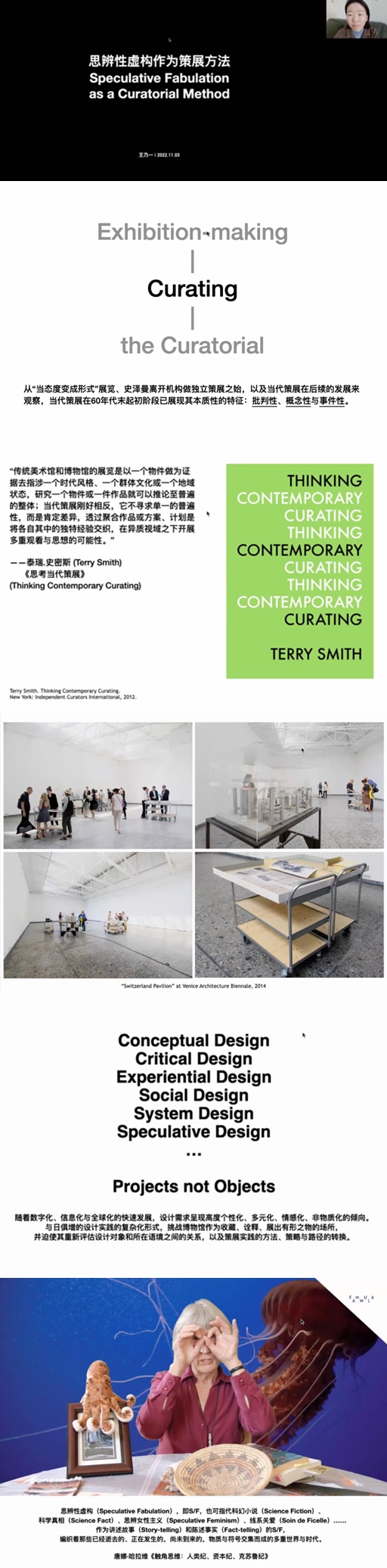 第五个演讲主题是《思辨性虚构作为策展方法》,策展人王乃一自2017年起,在中央美术学院设计学院开设“设计批评与策展研究”方向课程,从事设计策展的教学和研究工作。在主题演讲中,她基于“思辨性虚构”作为策展方法的理论反思与实践研究,旨在审视其对当下策展范式的影响,进而探寻关于策展潜在或可预见的未来。