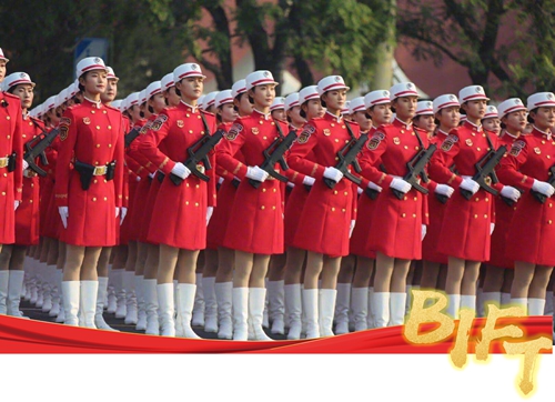 民兵方队领队 我校服装表演系教师赵冰清(前左)