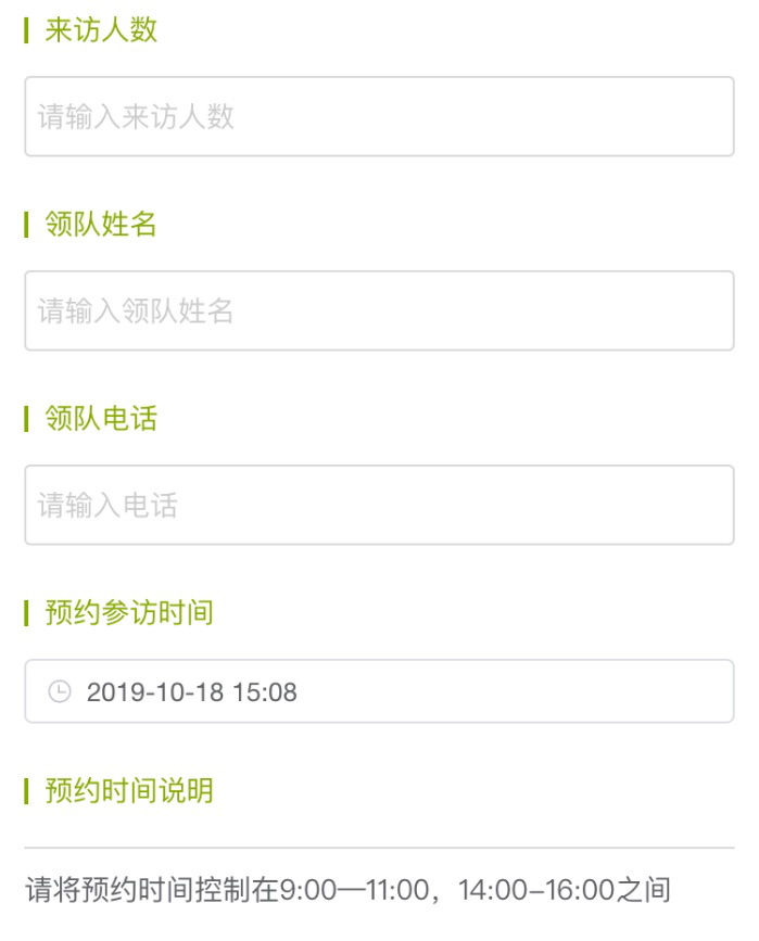 来宾向系统提供来访人数、领队姓名、领队联系方式、预约参访时间段(9:00——11:00或14:00——16:00)、是否需要讲解等信息后,等待党委宣传部及团委审核,收到反馈。