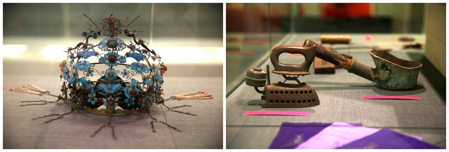第三单元为“清代至民国服装配饰”。展示了云肩、肚兜、莲鞋、荷包、点翠凤冠、簪钗头饰,以及民国女性内衣、绦子边、头花、旗袍领条等配饰件,折纸针线包、粉线袋、熨斗、裁剪纸花样、缝纫机等多种服饰制作工具。