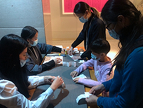 展览同步展出了馆藏清代折纸针线包的复制研究过程。为了更好地展示传统折纸针线包的巧思与妙用,博物馆师生对其折叠方法进行研究与复制实践,并将过程进行图示及视频拍摄,做成视频教程,展览期间在展厅内循环播放。折纸针线包可以用来放置零碎的小物品,实用又环保,展厅内准备了对应尺寸的折纸,现场观众可以跟随志愿者动手尝试,亲身感悟先人们在女红工具设计上体现的智慧,并制作一份属于自己的收纳神器。