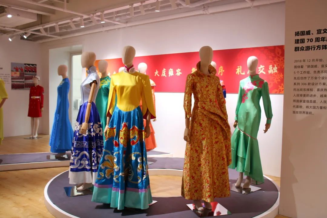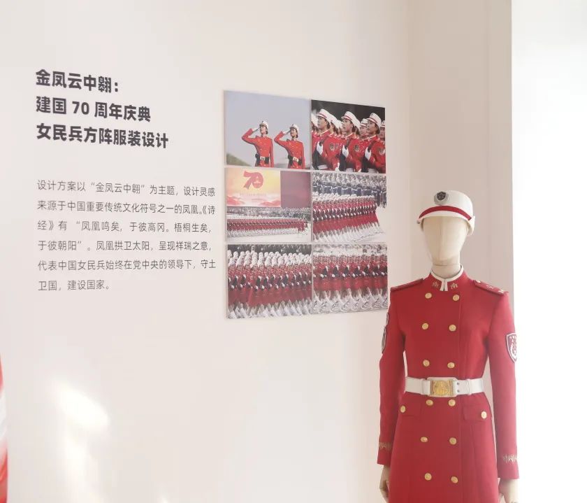 展区展示了建国70周年庆典工作的服装设计成果。2018 年 12 月开始,北服受指挥部委托,组建 5 个工作组,负责各方阵的服装设计工作。围绕着“扬国威、宣文化”的设计理念,先后创作万余个设计方案,最终定稿 55 个系列 306 款。此服装设计方案既烘托出欢乐祥和、喜庆热烈的节日气氛,又展现了人民审美的进步和越来越自信的精神风貌,描绘出国家富强昌盛、人民生活品质日益提升的时代面貌,将大国力量和灿烂文化更加生动地展现在世界面前。