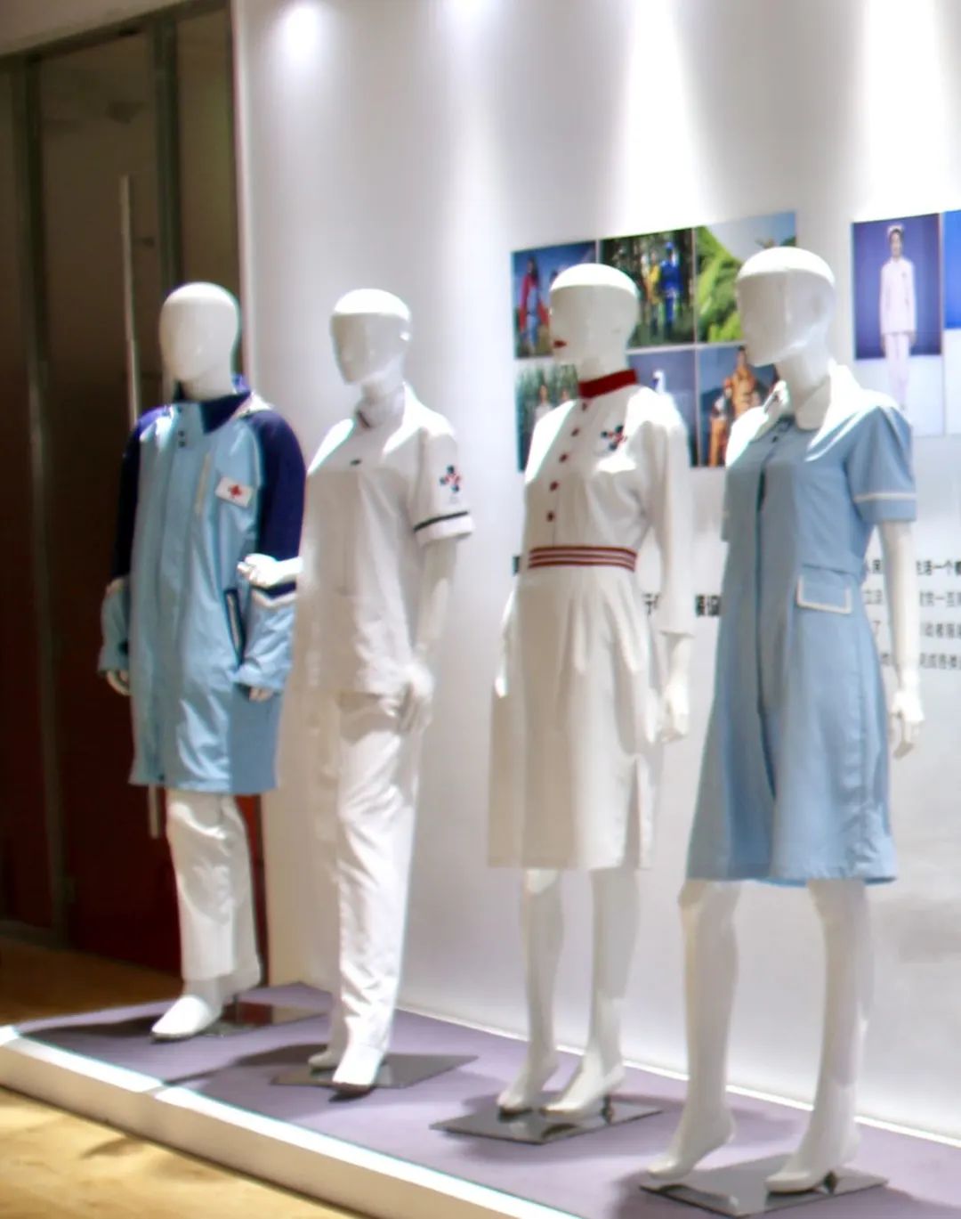 展区展示了2020 年疫情暴发后,北服教师研发团队完成 “最美逆行者——医护工作者服装设计研发”项目的医护工作服、医护礼服、患者服装、医用防护服和日常通勤防护服等多品类医护、防护服装设计。新研发的医护服装立足新冠疫情下医护、防护工作服装的新需求,采用含导电丝、石墨烯纤维等新材料的纤维面料,吸湿速干、细腻亲肤、抗菌防静电;防护功能工作服装则采用微多孔高透湿材料以及局部高效滤材,提高了防护服的透气、透湿性能。