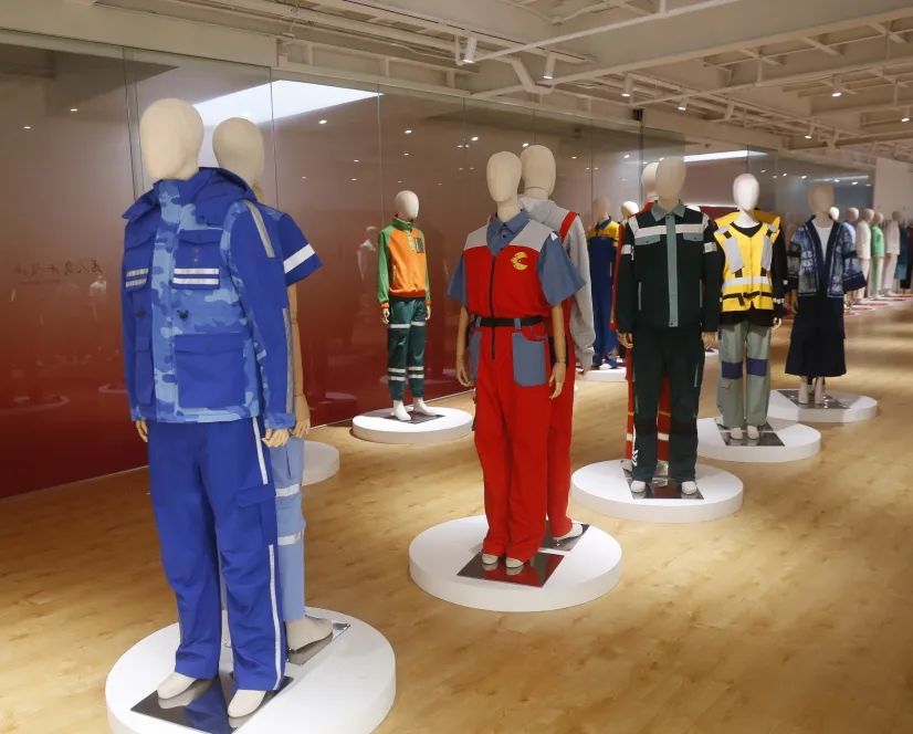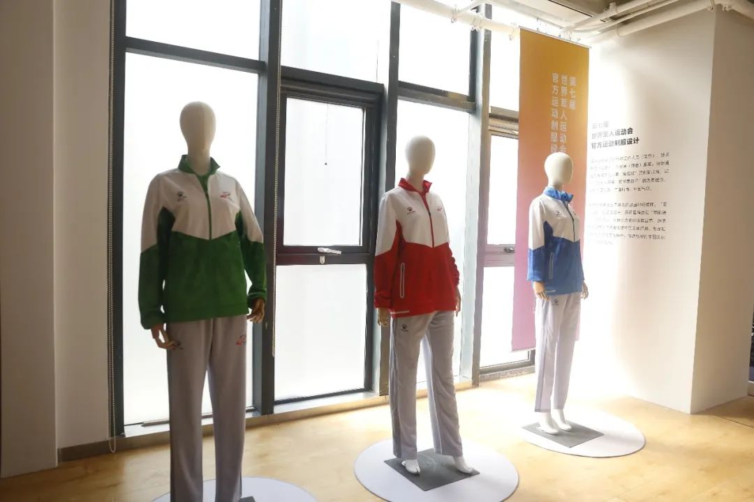 展区展示了军运会服装设计,包括工作人员(蓝色)、技术官员(红色)、志愿者(绿色)服装。设计通过对传统文化元素“田猎纹”的创新应用,融入“创军人荣耀、筑世界和平”的办赛理念,体现中国礼制、中国时尚和中国气派。