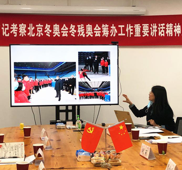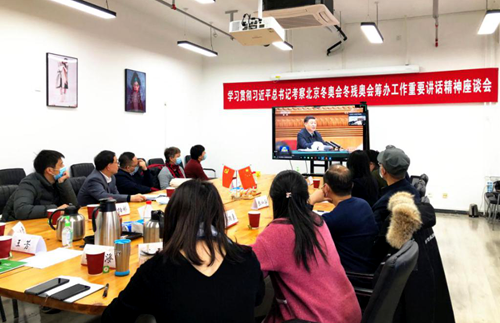 首先,与会人员集体收看了中央电视台《新闻联播》播出的相关新闻报道。随后,刘莉和大家分享了她在首都体育馆现场聆听习近平总书记讲话的感人场景。接下来,线上线下参会人员围绕学习贯彻习近平总书记考察北京冬奥会、冬残奥会筹办工作重要讲话精神进行了交流发言。