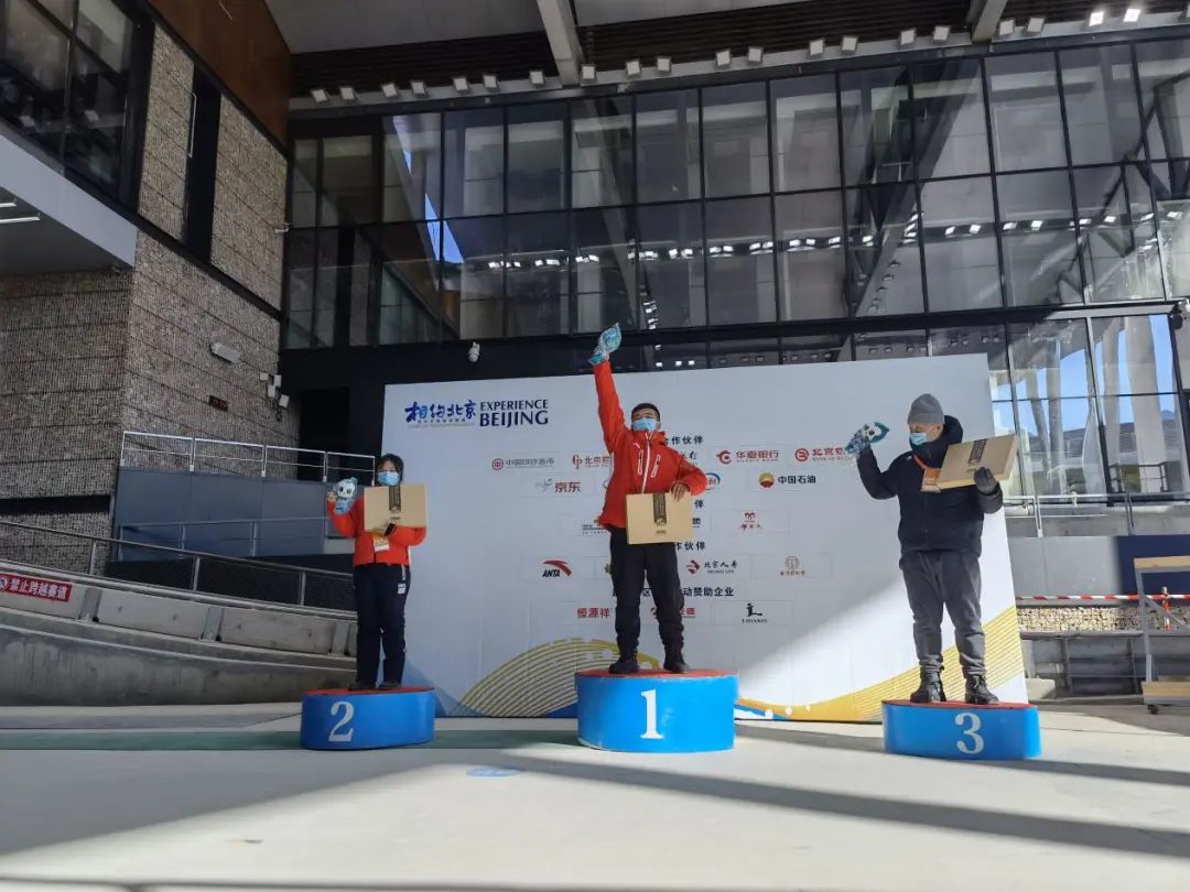 王天奇(中)在国家雪车雪橇中心进行颁奖仪式实地演练