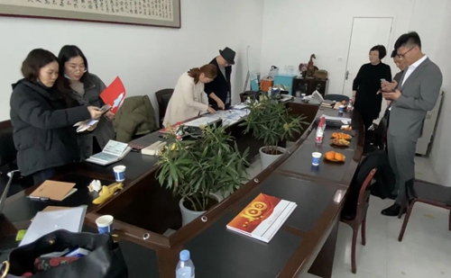 图为设计团队负责人邹游(二排右二)、服装艺术与工程学院党委书记徐桂枝(二排右三)带领团队参加设计策划评审会。在长达59天的评审时间中,“整理—运送—评审—运回—返厂—修改—发回—再整理”已经成为团队工作的常态