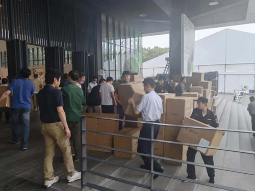 6月16日清晨,满载着献词团、合唱指挥及合唱团的全部服装、鞋品及相关服装用品的3辆重载货车进入bb贝博艾弗森官网,至此开启了在北服验收、储存、配发等工作