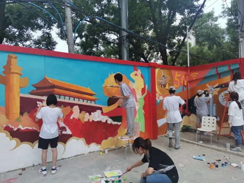 在艺术设计学院党委的带领下,艺术设计学院一年级学生团员和入党积极分子迎着烈日酷暑,在短短的三天时间内将庆祝建党100周年的六幅主题墙绘一气呵成,集中描绘与展示出中国共产党带领中国人民从站起来、富起来到强起来的伟大历史成就,用满腔热情与汗水勾勒出我校青年学子内心对党的赞颂与热爱。
