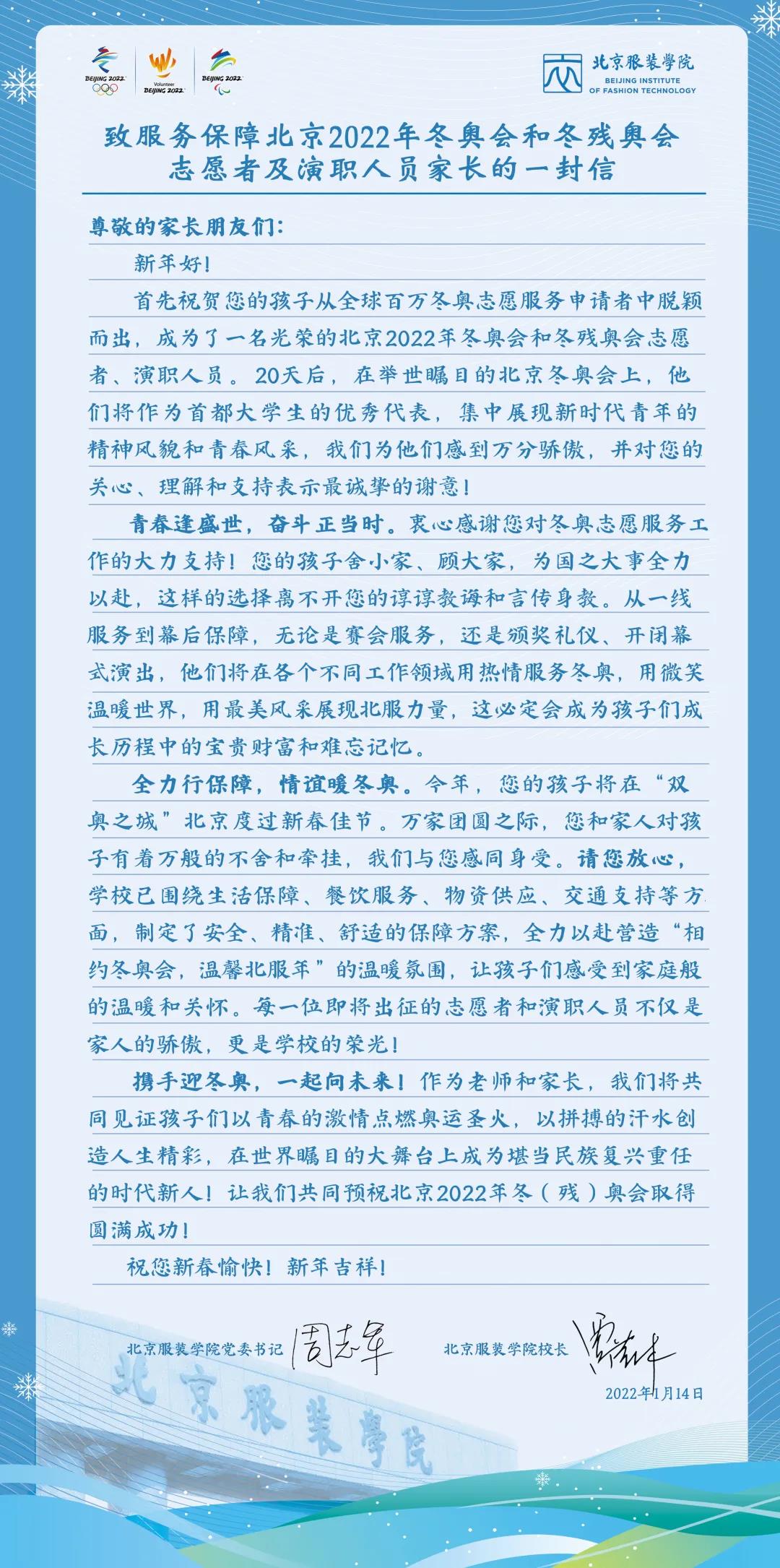 距离北京2022年冬奥会和冬残奥会开幕还有20天,由党委书记周志军、院长贾荣林亲笔签名的《致服务保障北京2022年冬奥会和冬残奥会志愿者及演职人员家长的一封信》,承载着温暖,遥寄大江南北,送往志愿者、演职人员的家。在信中,他们用朴实的话语送上最真挚的问候。