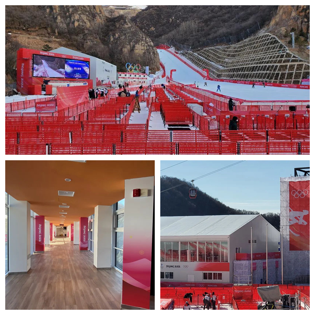 形象景观设计方案围绕服务比赛功能的原则,做到条理清晰、内外有别。运用霞光红、天霁蓝、冰蓝等色彩,结合核心图形中的绵延山形,展现出高山滑雪特征与运动之美。同时恰当烘托赛事气氛,明确区域、动线识别,融合天然山形景色,营造出雪画冰印的意境。